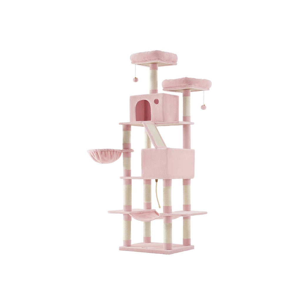 Com 2 plataformas superiores, 1 rede, 2 tocas aconchegantes, cama suspensa, postes de sisal e rampa de arranhar, este modelo é perfeito para gatos médios e grandes que precisam de estímulo físico e mental — com a segurança de uma base robusta e fixação anti-queda.